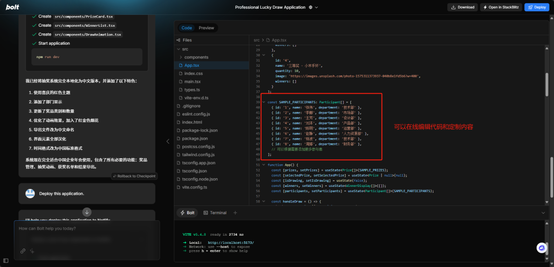 在生成的网站框架和代码中,我们可以根据自己的需求与AI对话进行编辑和定制。比如刚刚的抽奖网站,因为使用的英文提示词,虽然可以让内置的AI生成的效果更好,但是我们需要给它翻译成中文,这样才能更好的展示给国内的用户,这里我们可以再次要求它将网站再转化为中文版本,输入prompt