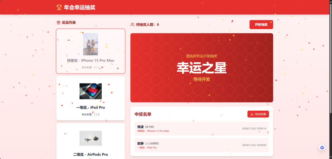 “为公司年会设计一个专业的抽奖应用程序。该工具应包括奖品管理、动画效果、中奖者显示和结果导出等功能 —— 类似于 GitHub 上的热门抽奖项目。请确保它在视觉上具有吸引力,并且适合在公司活动期间在大屏幕上显示。”
