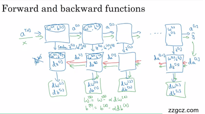 对反向传播的步骤而言,就是对正向传播的一系列的反向迭代,通过反向计算梯度,来优化我们需要训练的$W$和$b$。 把${\delta}a^{[l]}$值进行求导得到${\delta}a^{[l-1]}$,以此类推,直到我们得到${\delta}a^{[2]}$和${\delta}a^{[1]}$。反向传播步骤中也会输出 ${\delta}W^{[l]}$和${\delta}b^{[l]}$。这一步我们已经得到了权重的变化量,下面我们要通过学习率来对训练的$W$和$b$进行更新,